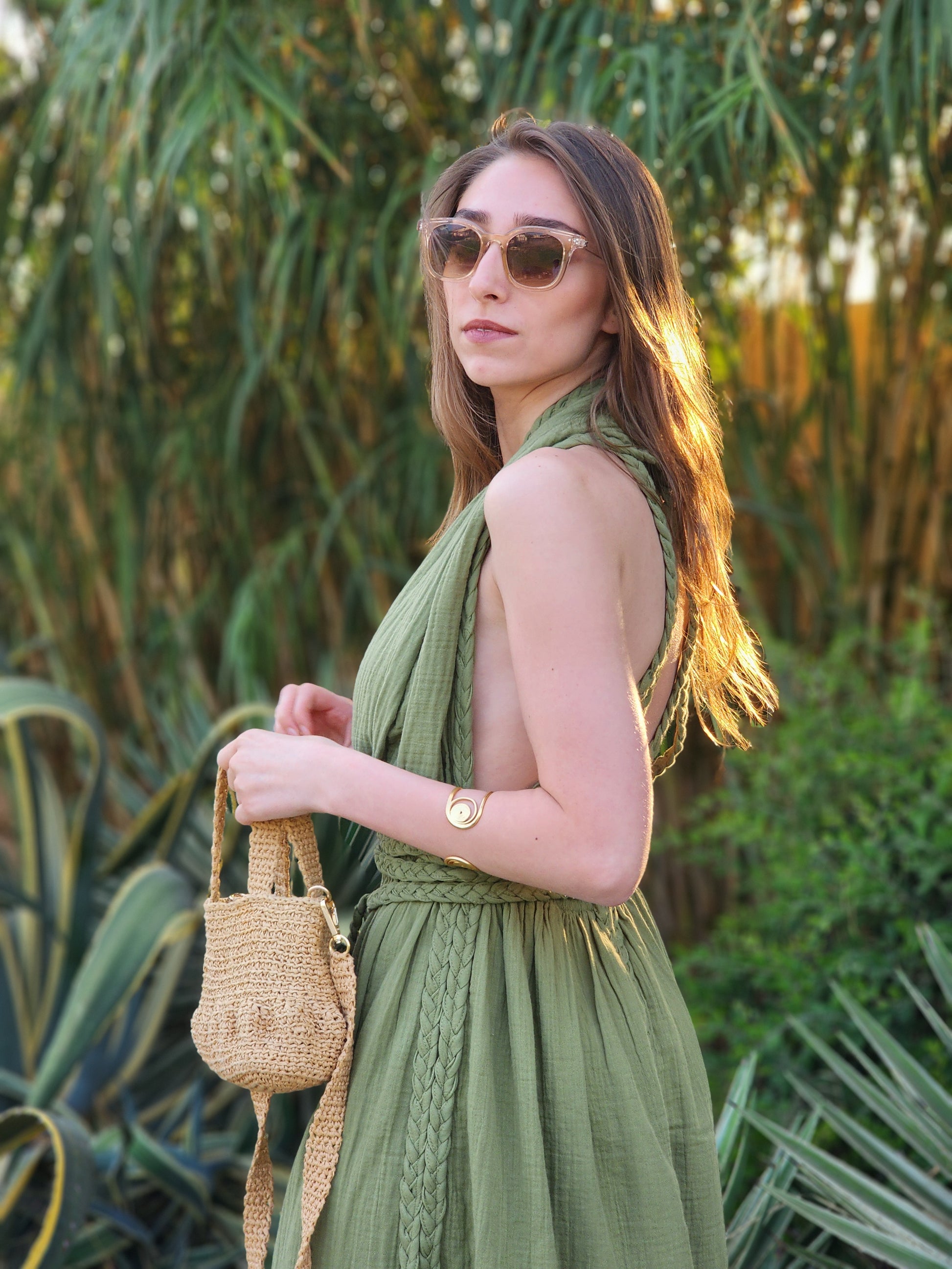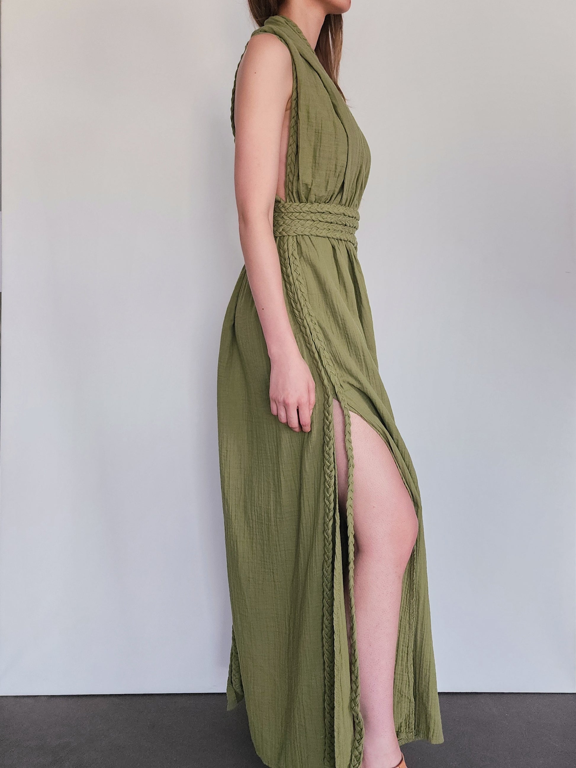 Greek-style dress features intricate braids cascading from top to bottom, creating a timeless yet modern look. The highlight of the design is the bold braided X back detail that adds a unique touch of sophistication. With slits on all sides, this dress offers a chic silhouette that flows beautifully, making it suitable for both casual chic and formal outings.