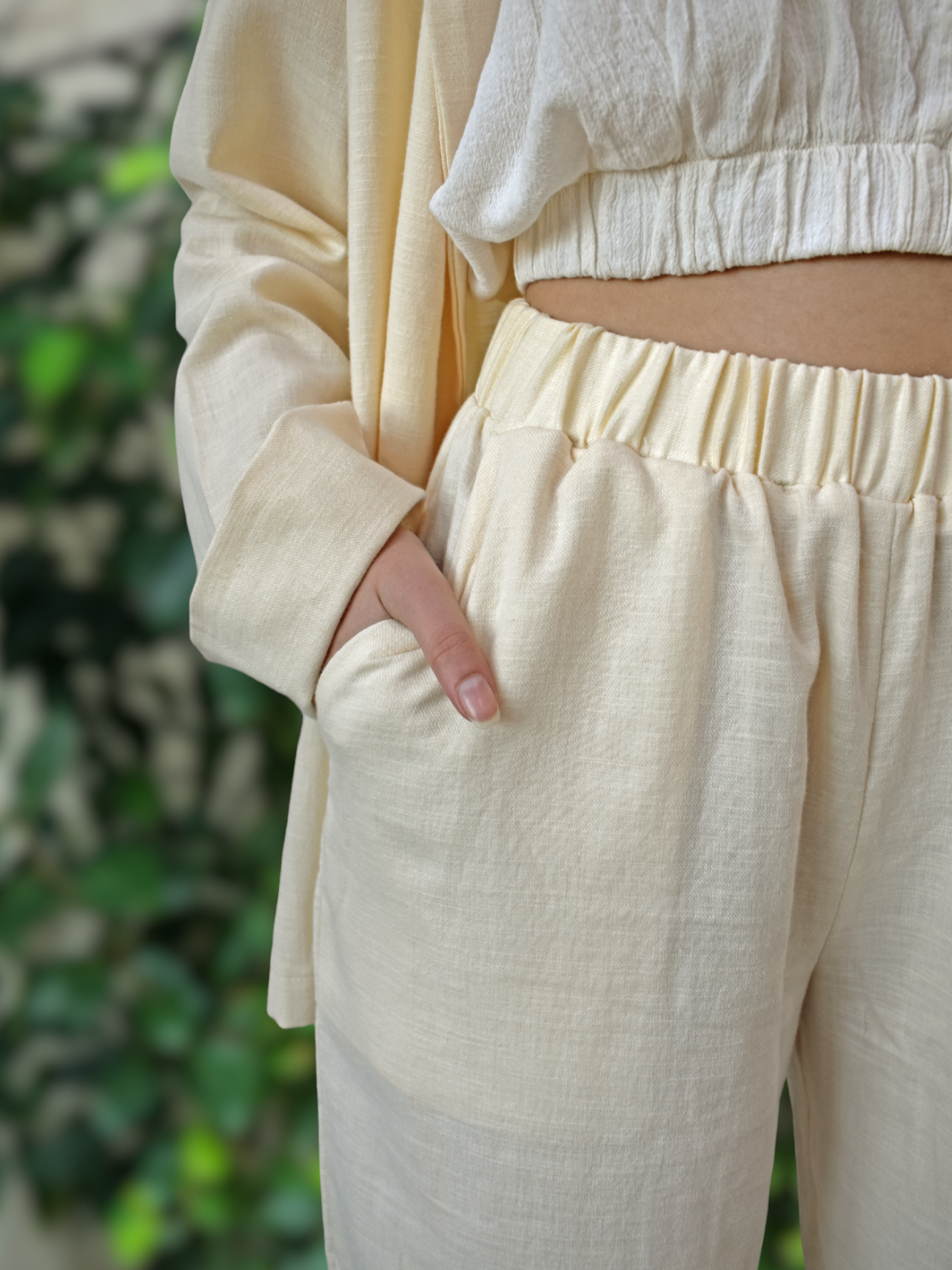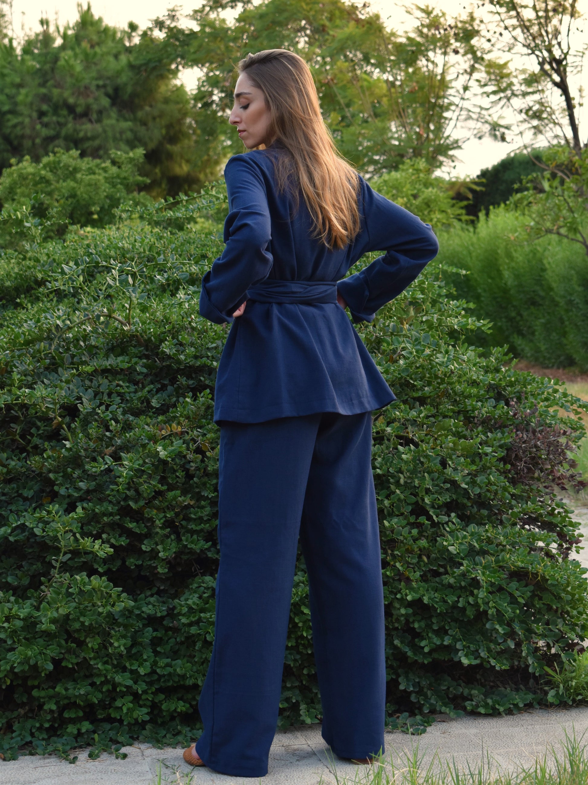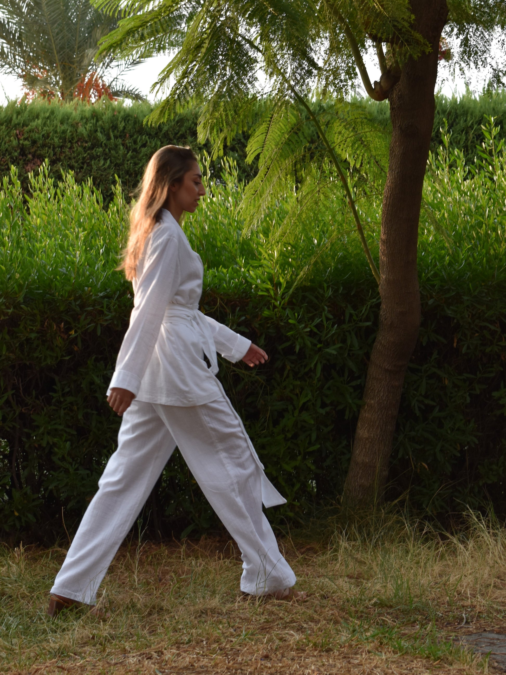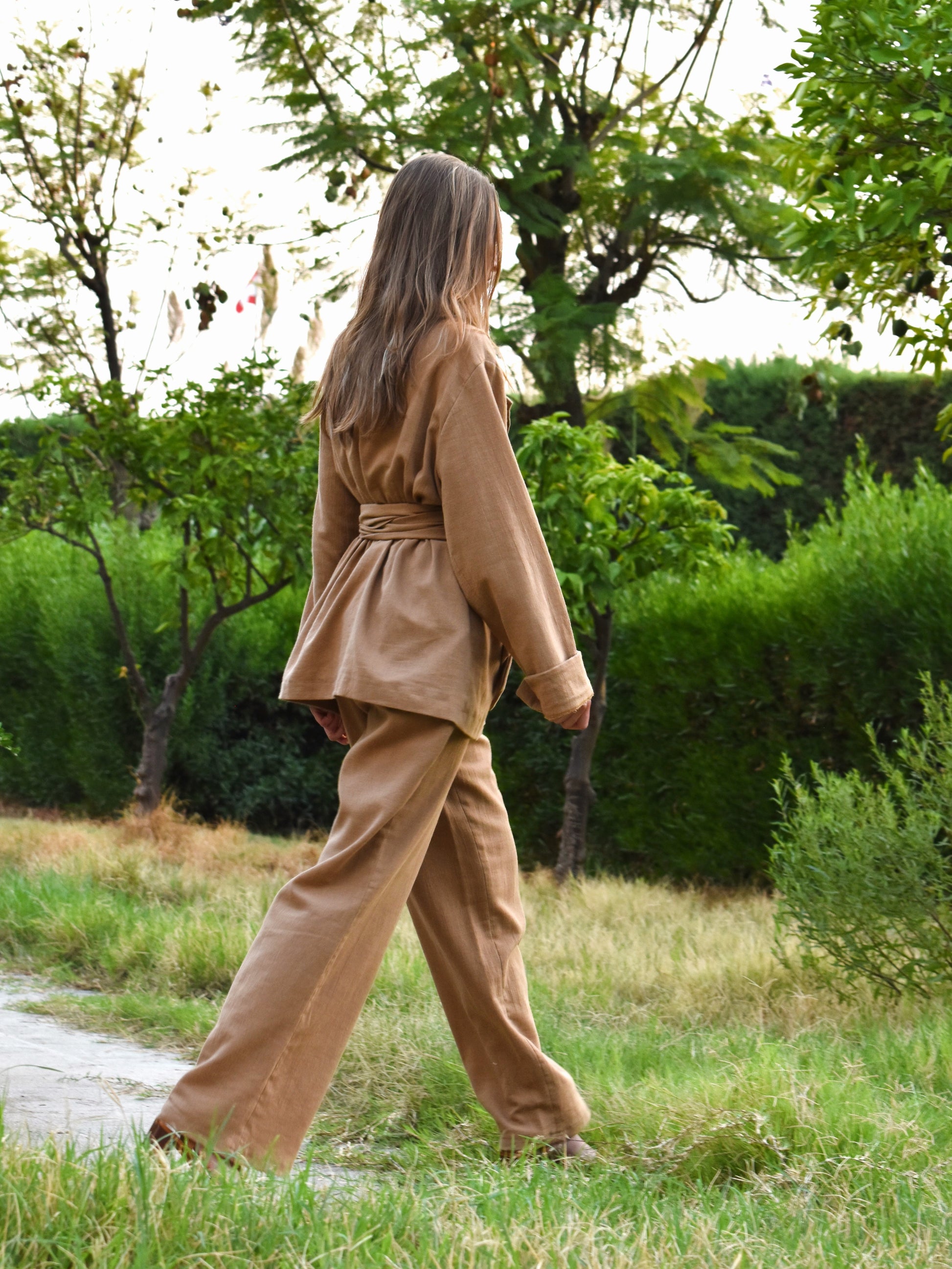 Elevate your style with our Natural Linen Blend 2-Piece Haya Suit. The loose-fit jacket features a wrap belt and roll-up sleeves, adding a touch of effortless sophistication. Paired with straight-cut pants that offer a comfortable fit, an elastic waistband, and convenient pockets, this ensemble combines timeless charm with modern comfort for any occasion.