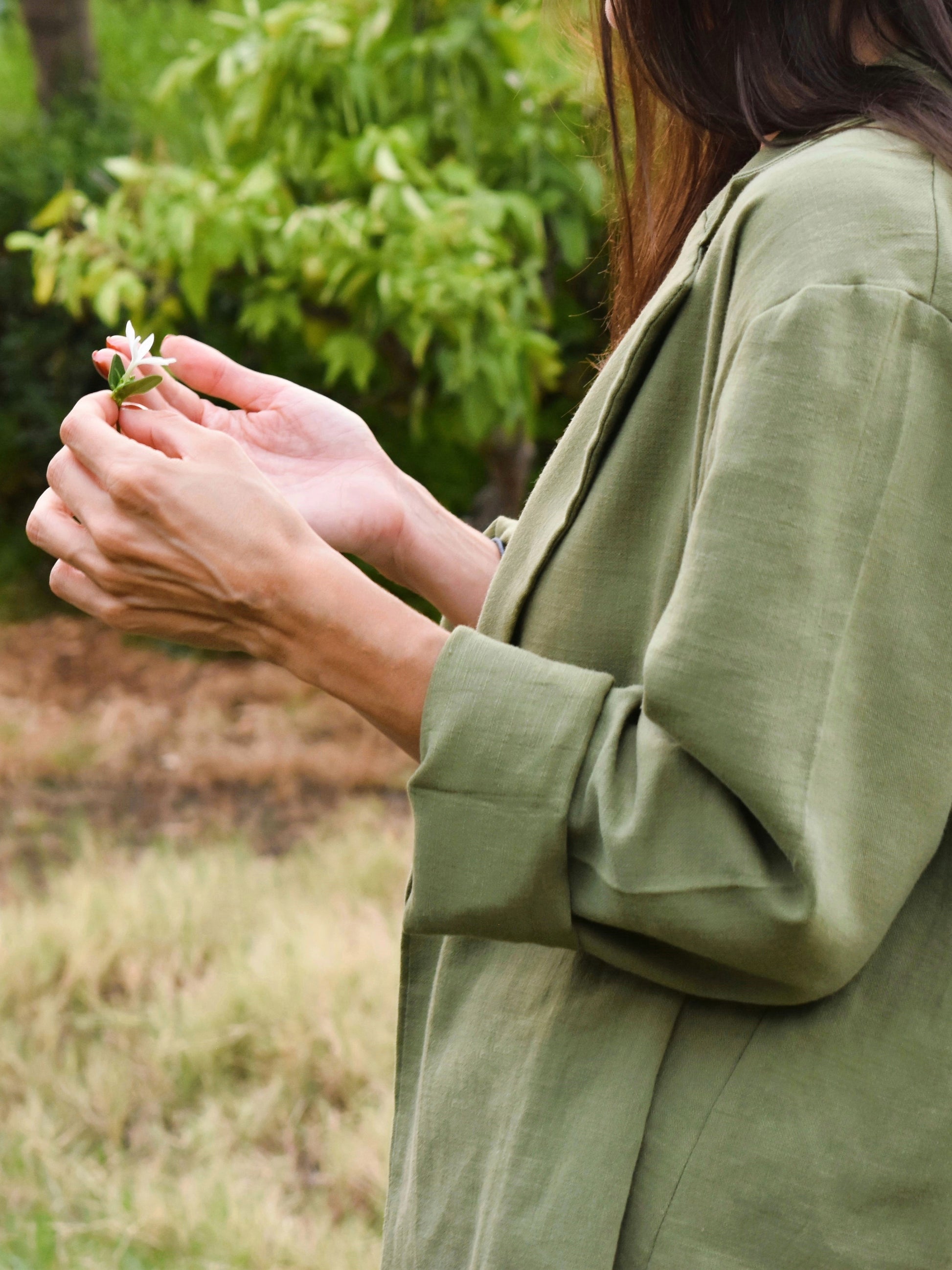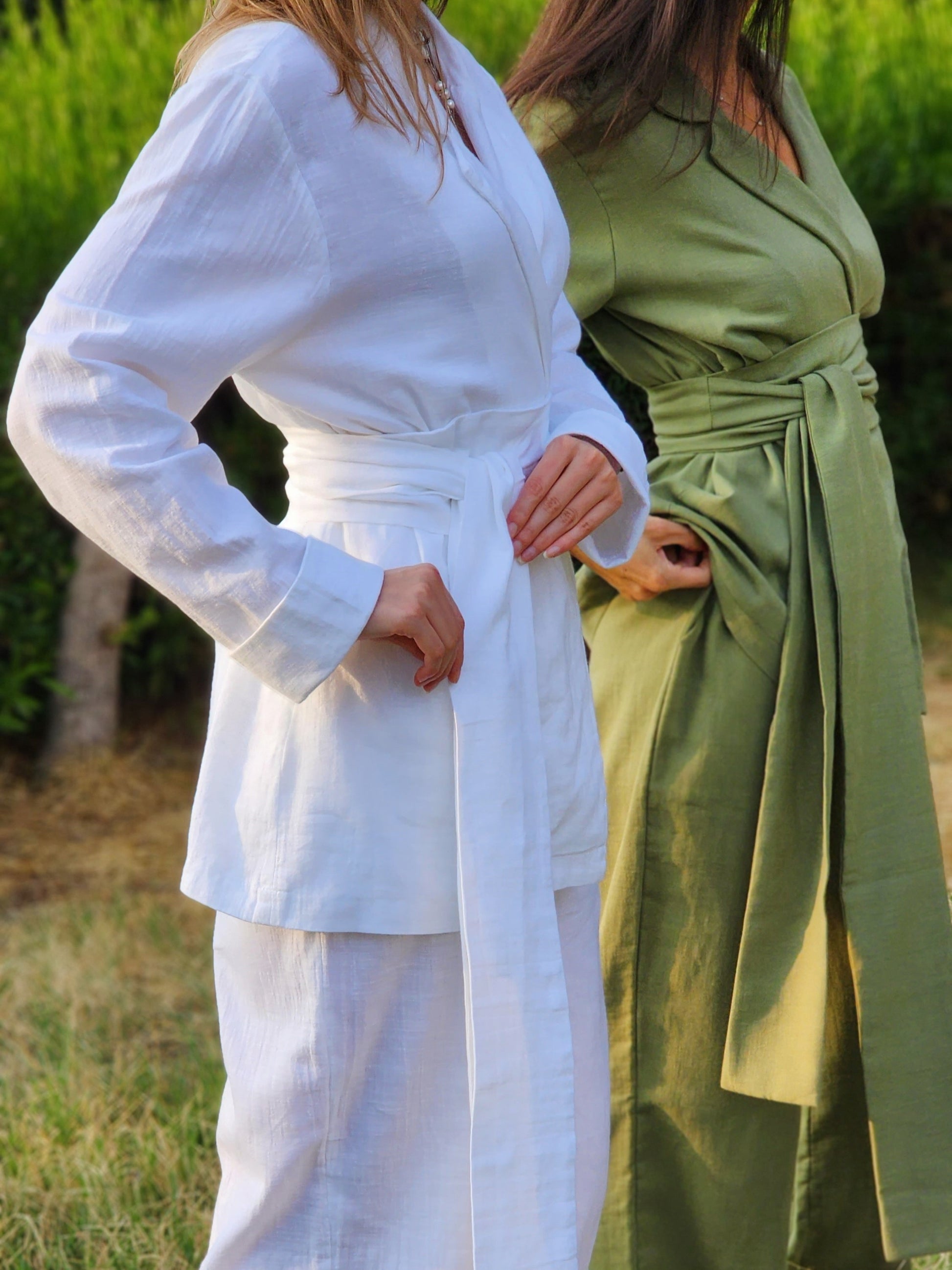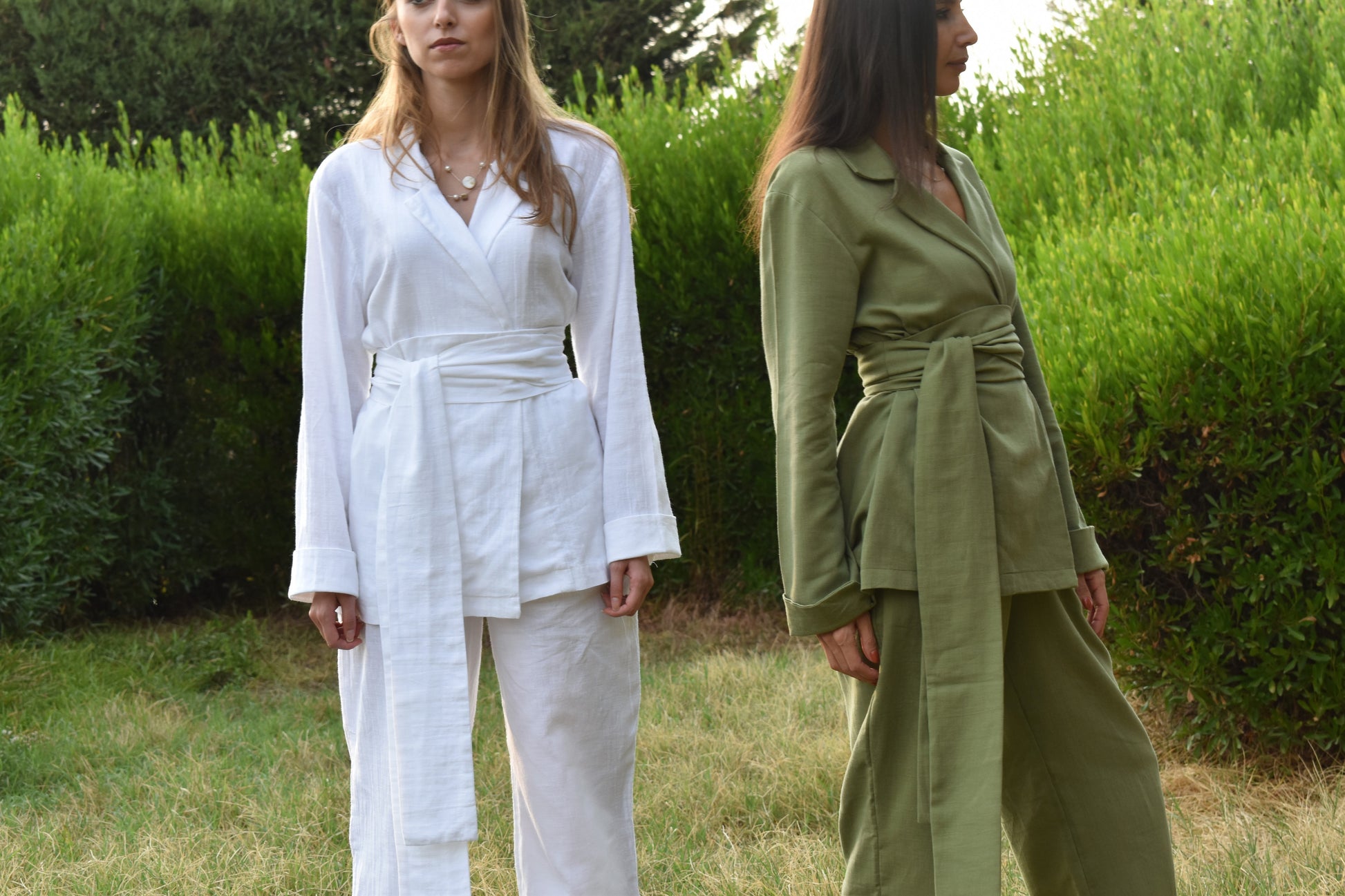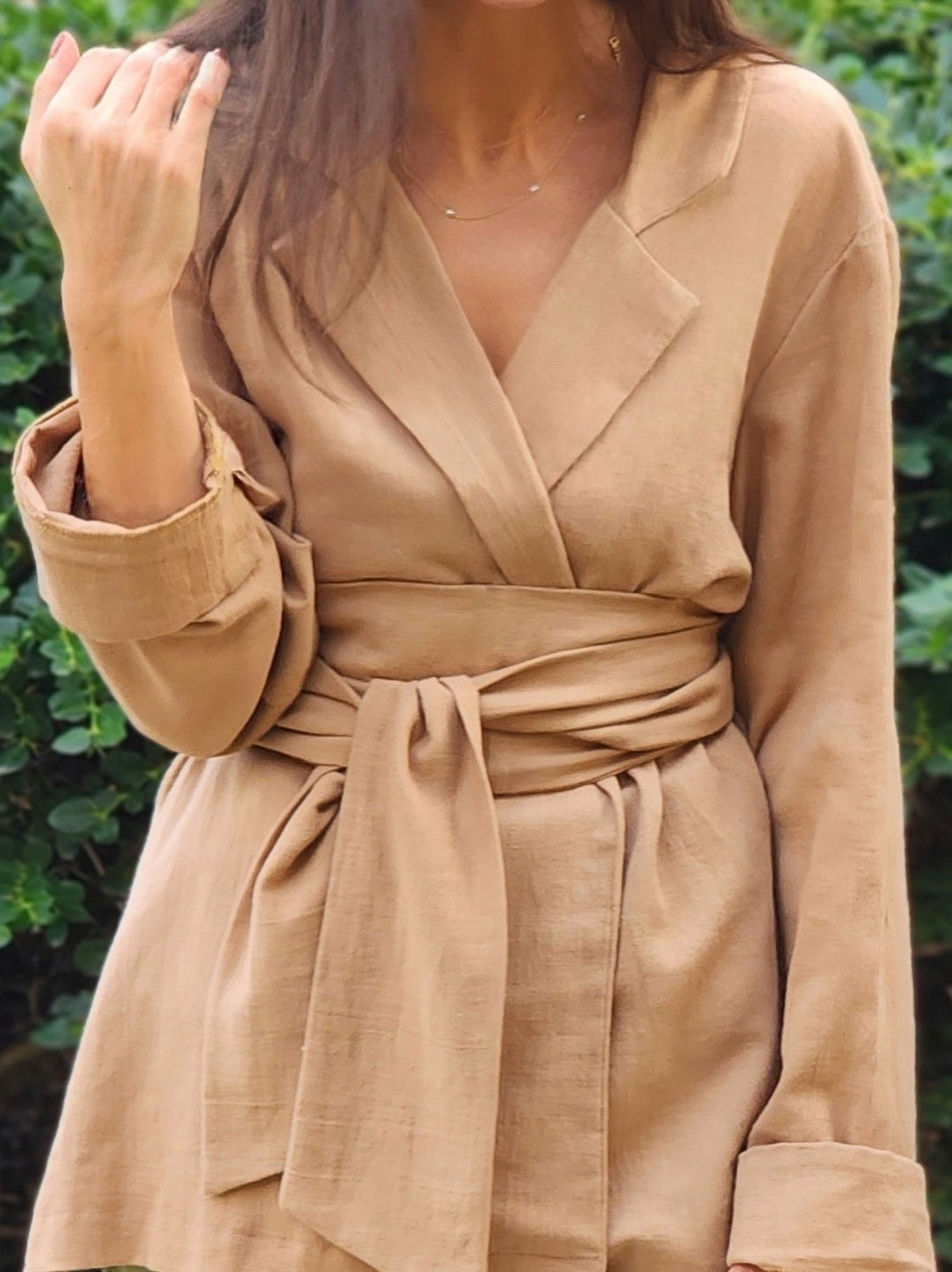 Elevate your style with our Natural Linen Blend 2-Piece Haya Suit. The loose-fit jacket features a wrap belt and roll-up sleeves, adding a touch of effortless sophistication. Paired with straight-cut pants that offer a comfortable fit, an elastic waistband, and convenient pockets, this ensemble combines timeless charm with modern comfort for any occasion.