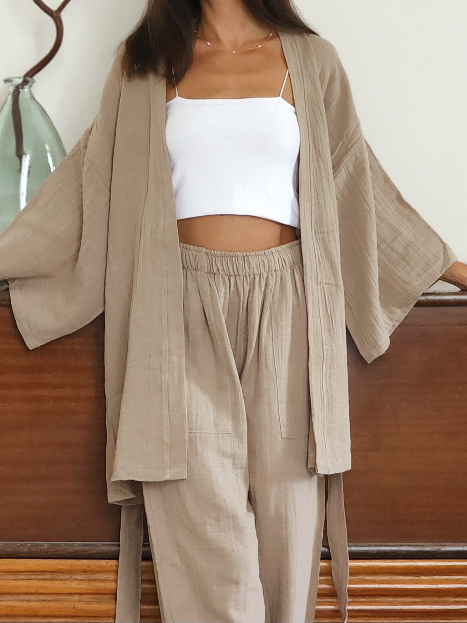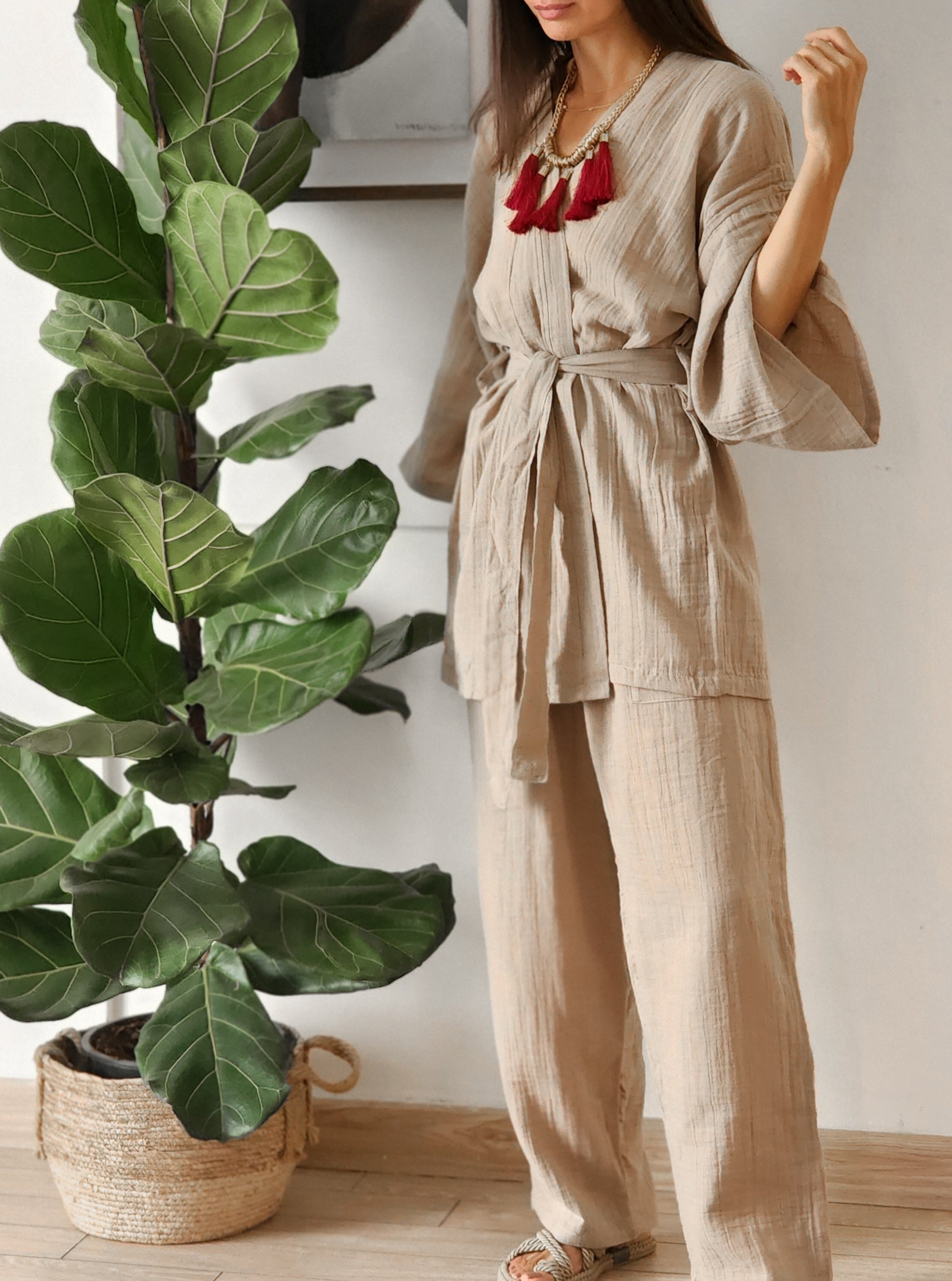 Kimono jacket and pants set in luxurious muslin fabric, perfect for casual and comfortable occasions. The set is a one size fit combines relaxed sophistication with breathable comfort, making it an ideal choice for any laid-back event. Whether you're lounging at home or stepping out for a relaxed outing, this ensemble promises effortless style and ease.