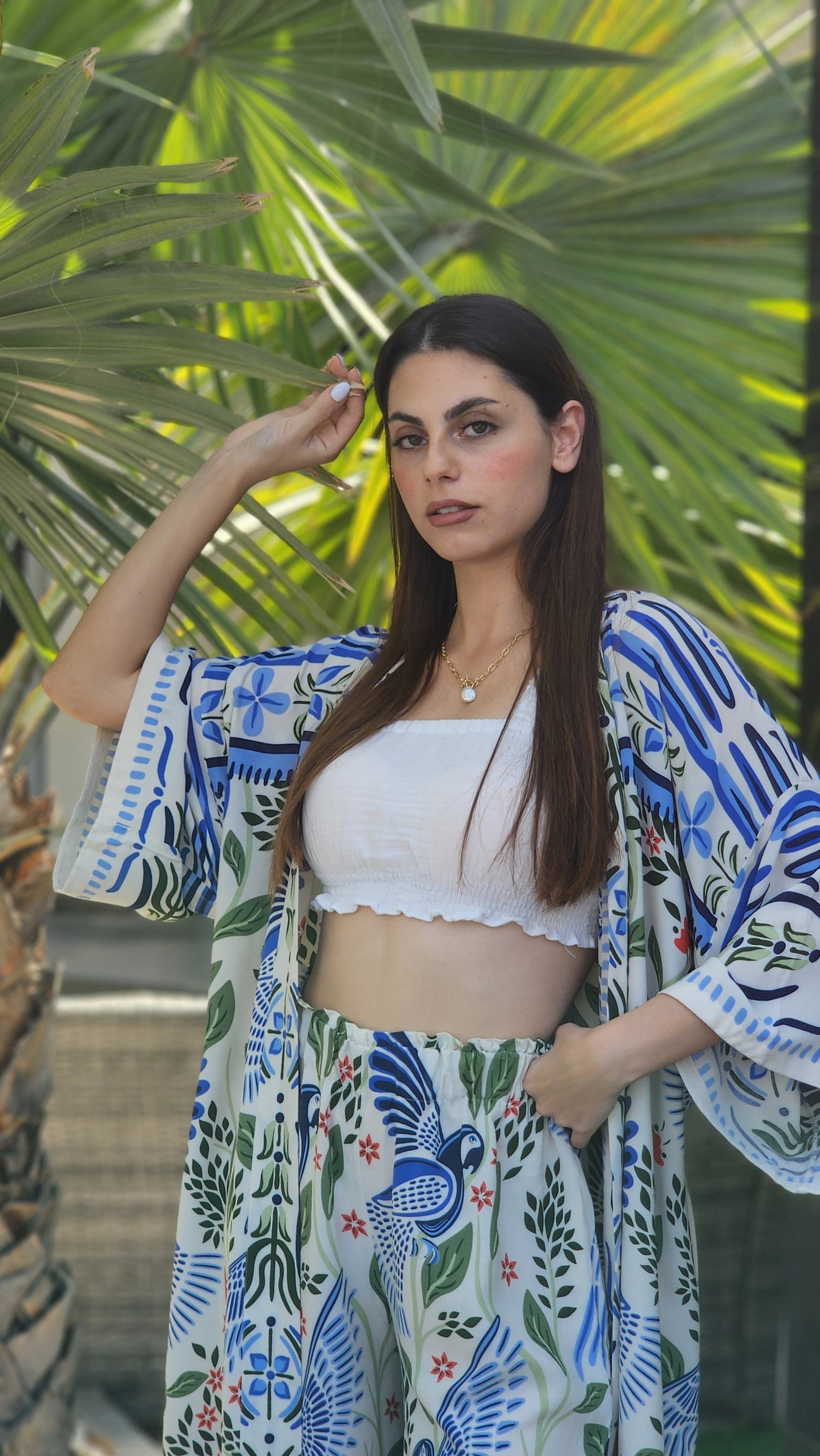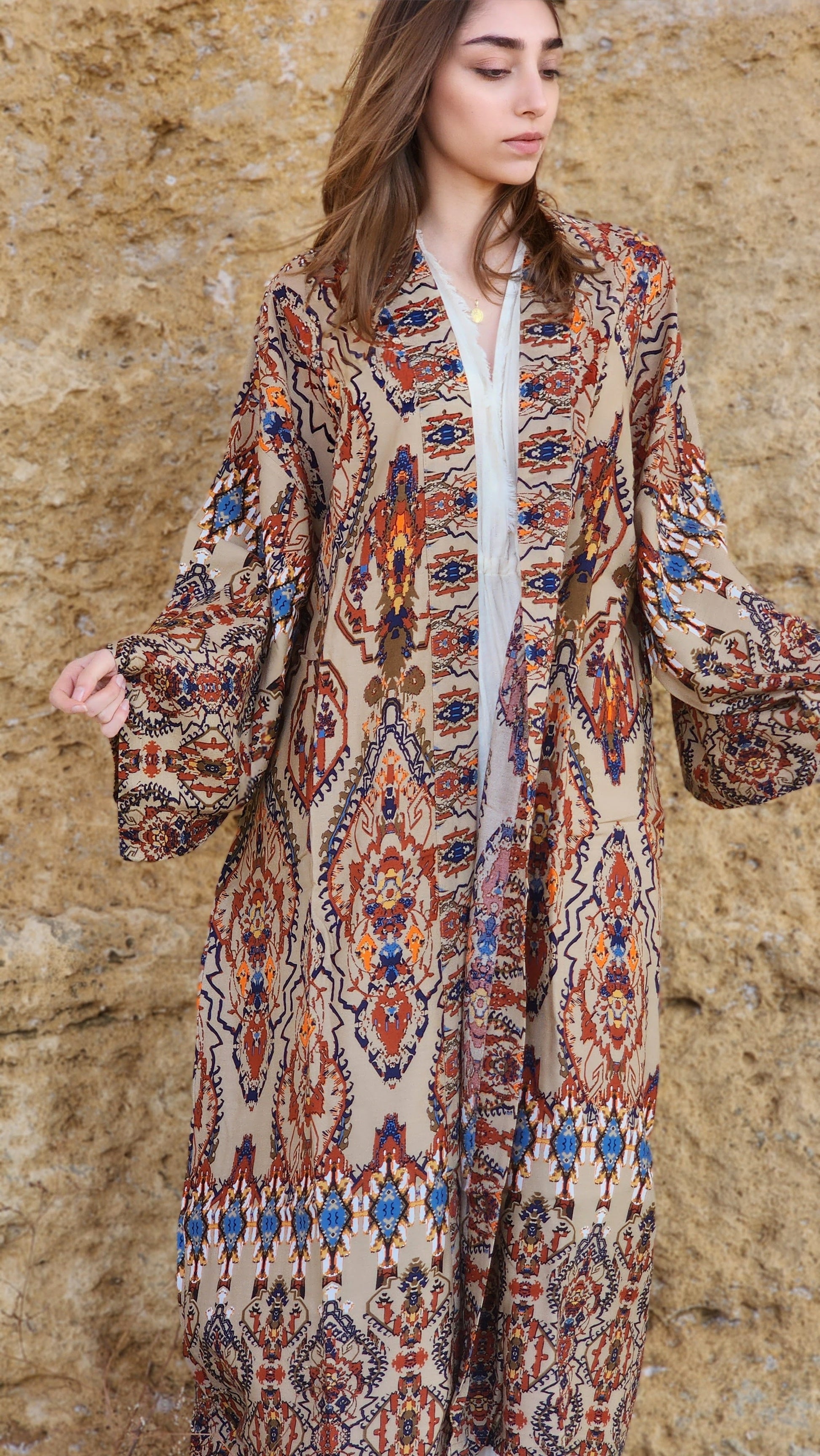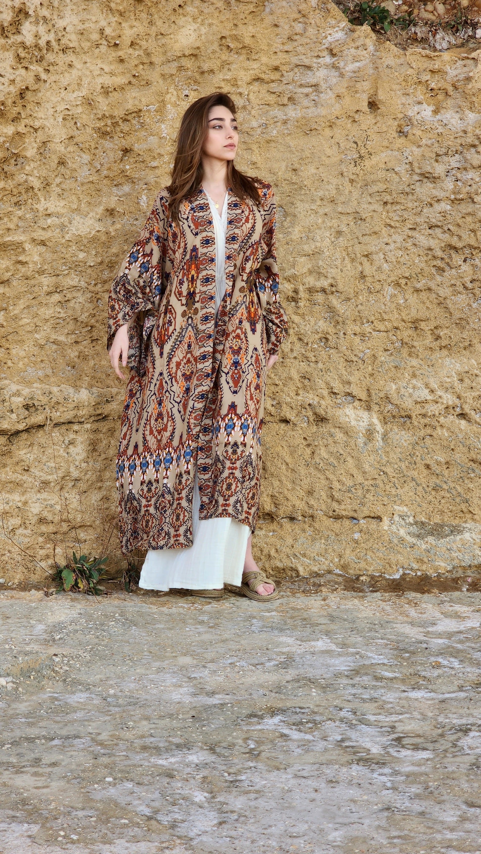 Reem Loose-Fit Long Kaftan in organic cotton blend pattern fabric, complete with a matching belt for a versatile and fashionable look.