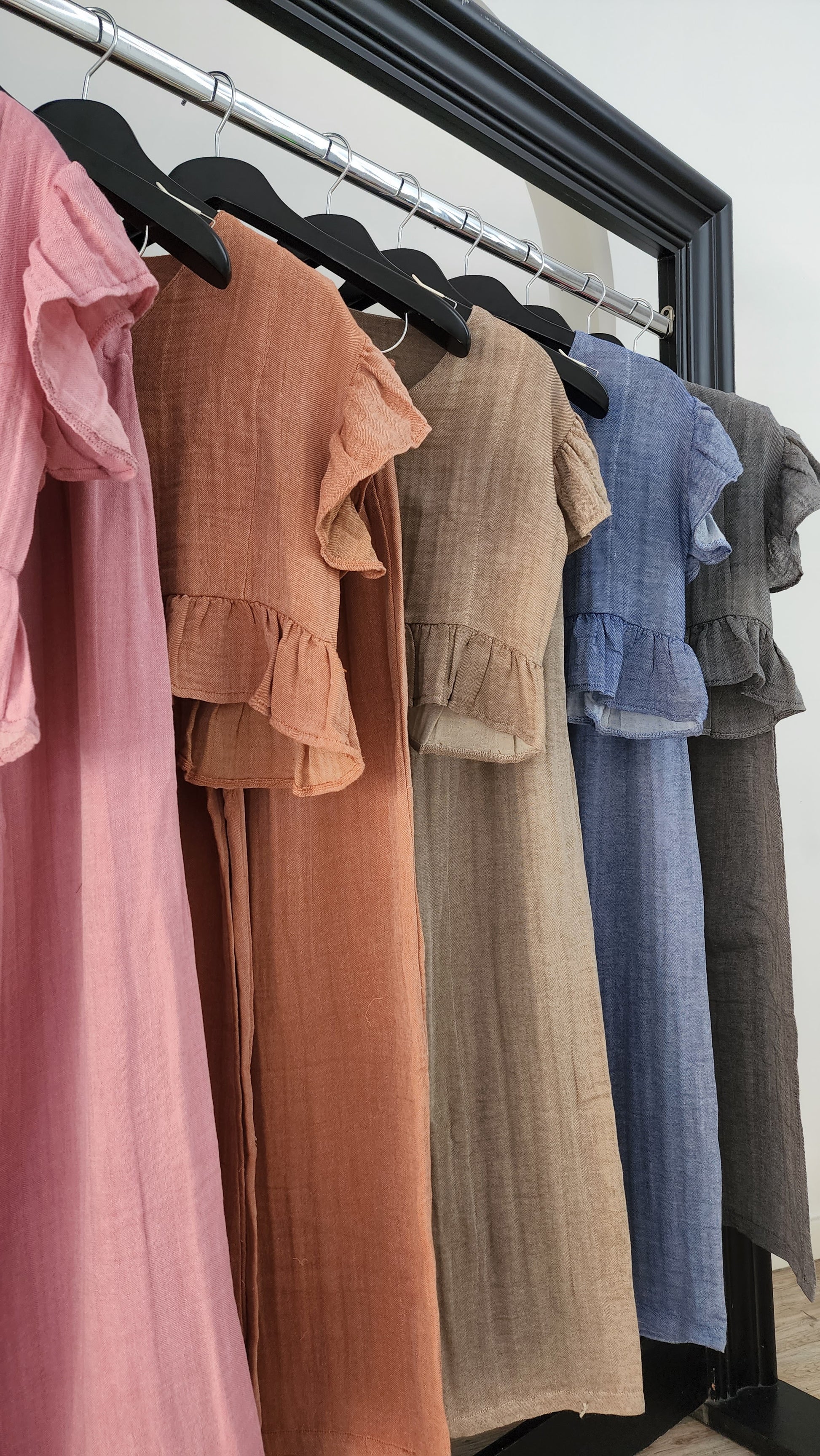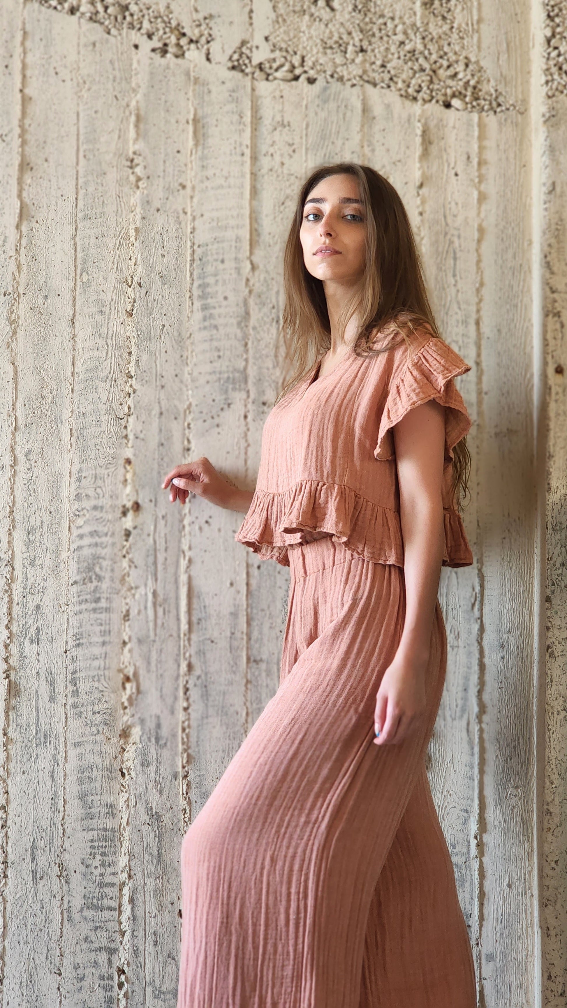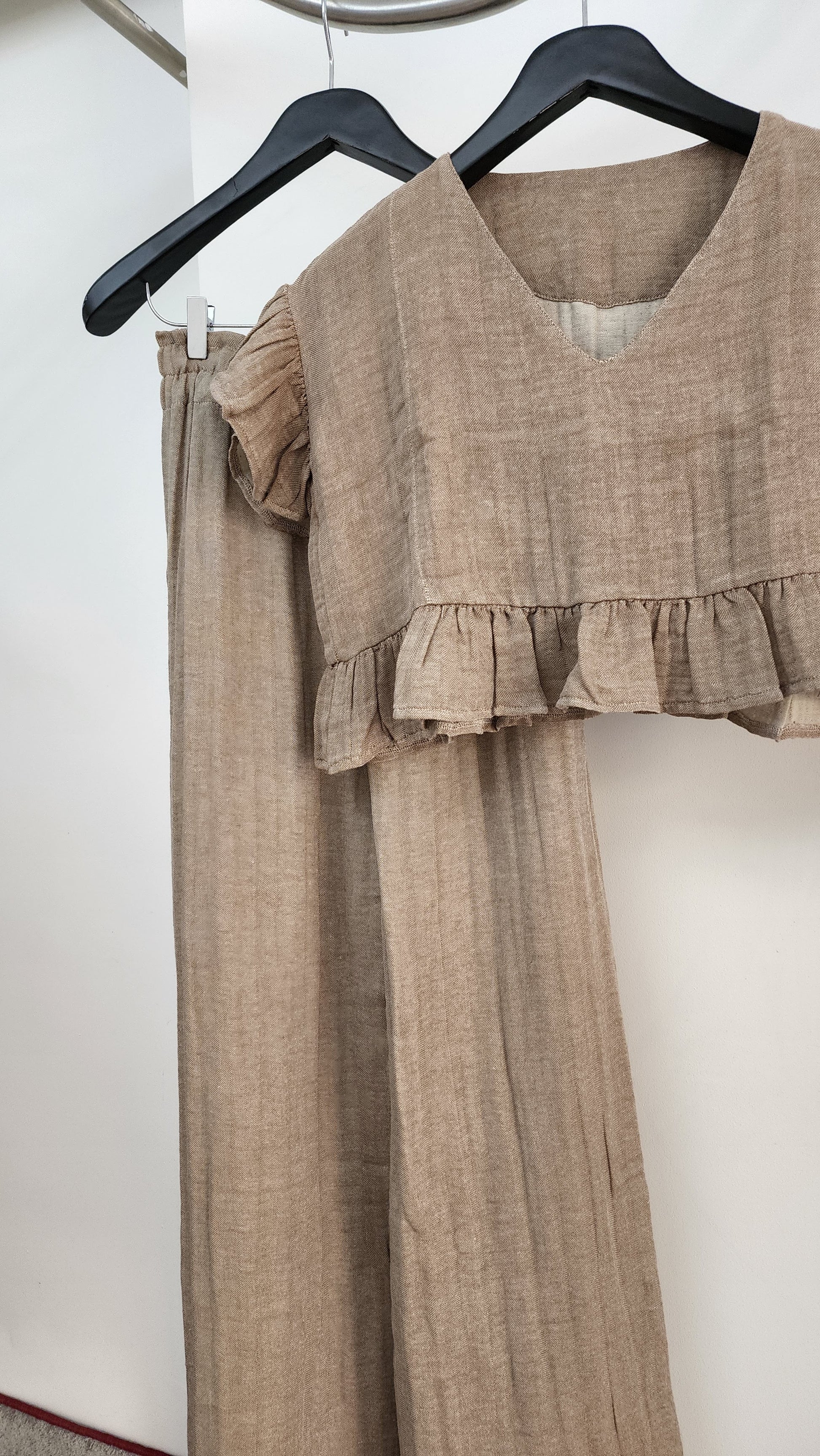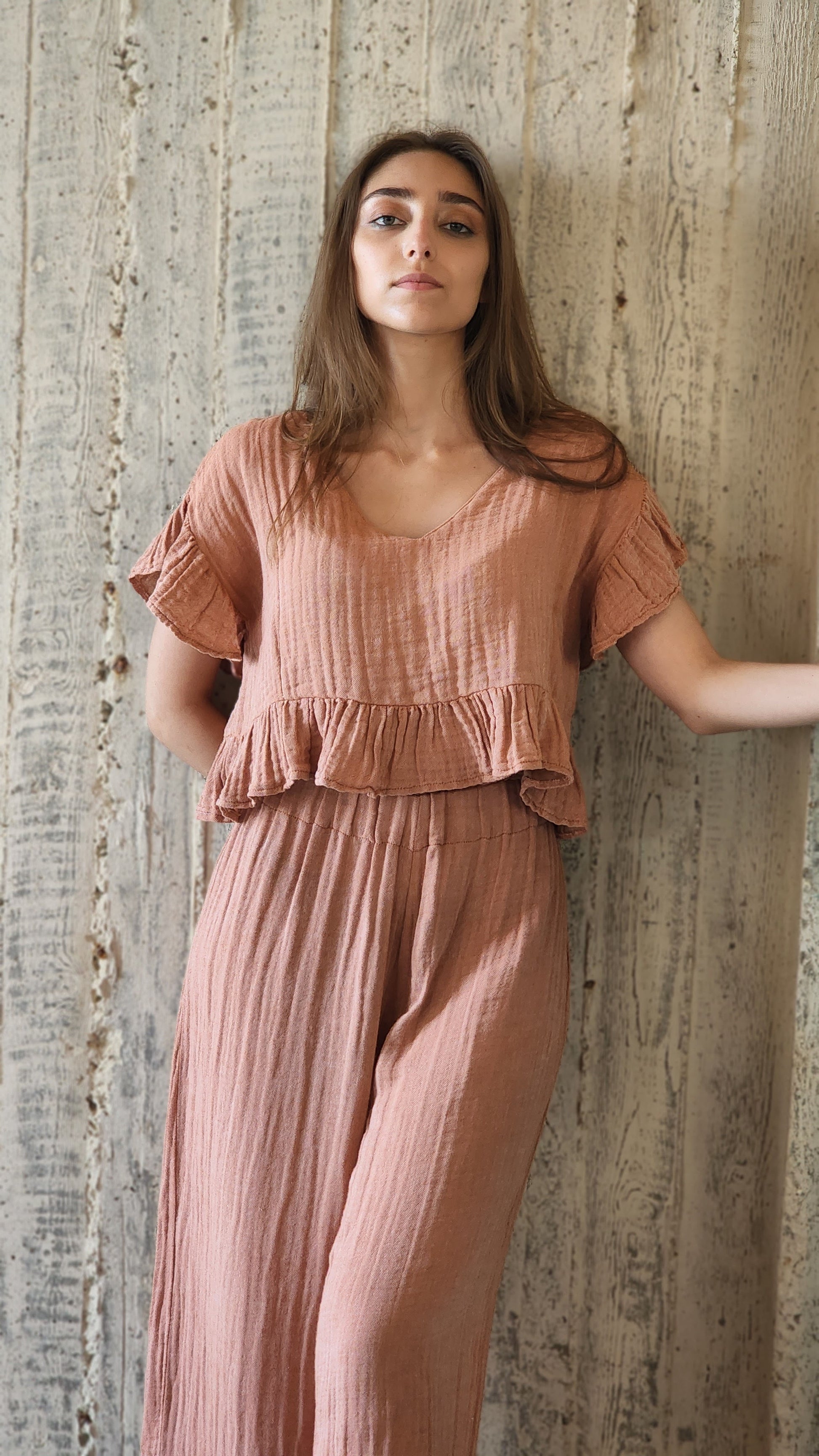 The Jasmine set is the perfect ensemble for those looking for the ideal combination of casual chic and elegance. The loose fit top features ruffled sleeves and across the waist, while the loose fit trousers lend a sense of effortless comfort.